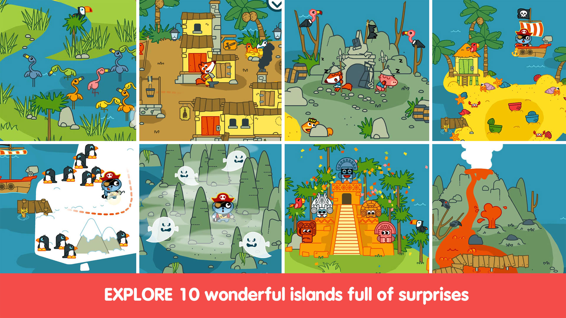 The treasure hunt begins! Pango is a famous pirate! EMBARK on his boat equipped with a cannon and a black flag. TRAVEL the seas with him. Seek adventure from island to island. EXPLORE a world full of funny pirates, tropical animals and friendly sea monsters. Onward, ho, sailor! A RIDDLE awaits you on every island. Will you be able to unravel its mystery? OPEN a secret passage, FIND YOUR WAY though a labyrinth, REBUILD lost monuments, ACTIVATE a strange mechanism, or SORT seashells... Your mission: FIND 21 incredible treasures and BRING THEM BACK to Pango Island. A game to sharpen your sense of direction! A game of OBSERVATION since you'll need LOGIC and SKILL to solve the puzzles! With Pango, use your IMAGINATION! To learn more: http://www.studio-pango.com FEATURES - EXPLORE an ocean populated by 10 islands and several sea monsters - SOLVE over 30 simple puzzles - COLLECT 21 treasures and hundreds of coins - No stress, no time limit, no competition - Beautiful scenery and flawless character interaction - Perfect for children ages 3 and older - A simple, functional application - Internal parental control - No in-game purchases and no invasive advertising